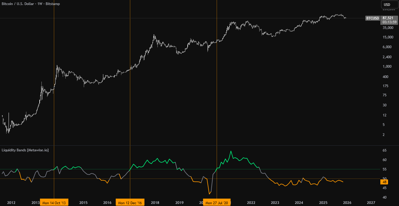 Liquidity Bands is a macroeconomic indicator designed to identify shifts between risk-on and risk-off market environments by tracking changes in underlying economic momentum and liquidity conditions. It provides a high-level view of where the market sits within the broader business cycle, helping traders and investors understand when conditions favor growth assets versus capital preservation.