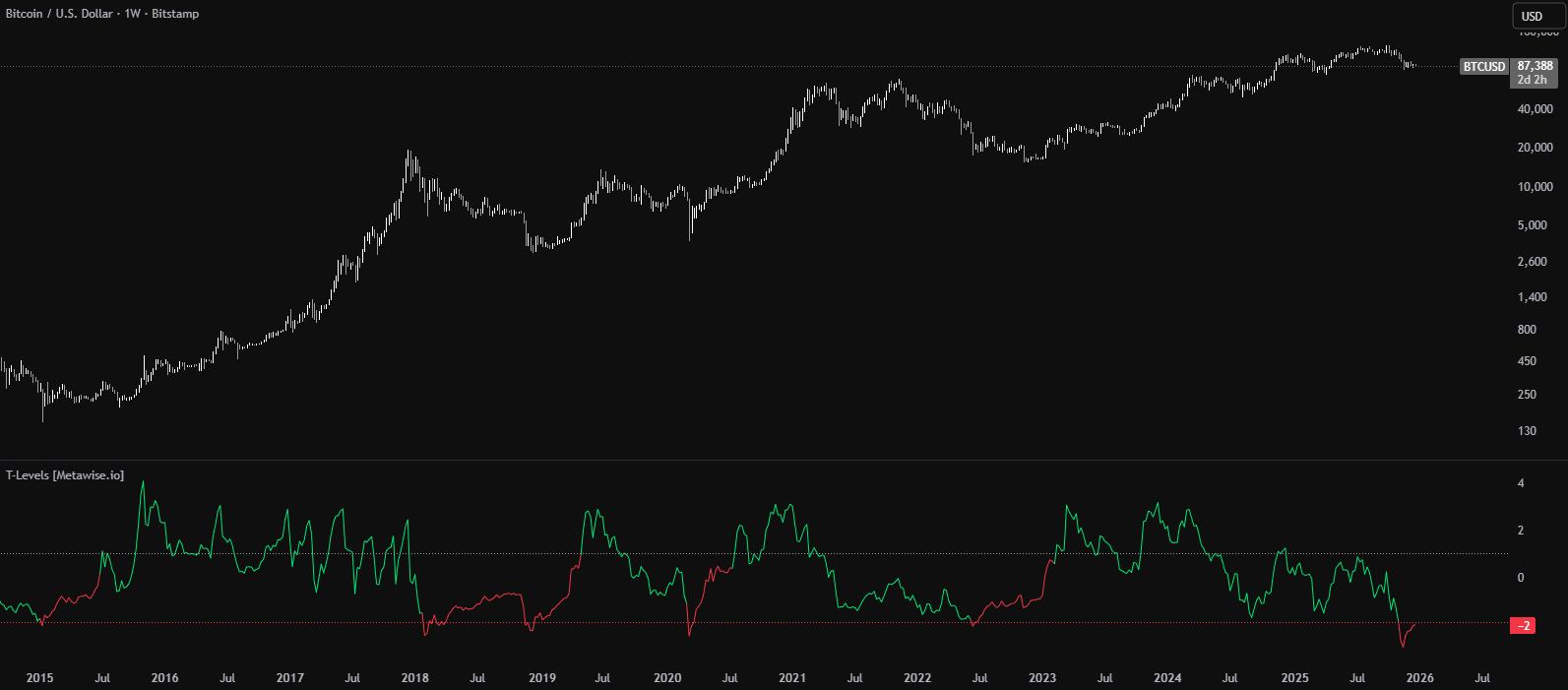 Momentum Value and T-Levels are best used together for confirmation. When both indicators enter their red zones simultaneously, it signals that downside pressure has reached an extreme and the market is likely forming a major bottom. This alignment represents a high-conviction environment where risk becomes increasingly asymmetric in favor of long-term positioning.